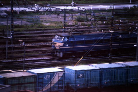 出発前、ホテルの窓から。東海道線は111系、113系がまだまだ幅を利かせていた。手前の青いJRコンテナも懐かしい