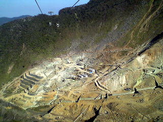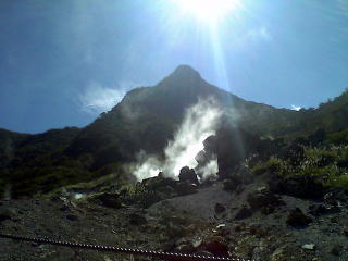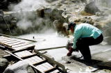 ここで温泉たまごを作る。おじさんタマゴを引き上げるの図。このあと、タマゴは簡易ロープウェイで下の売店まで運ばれる。