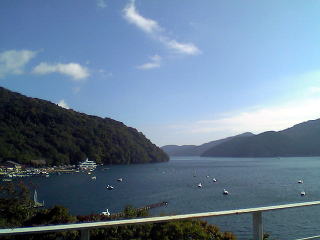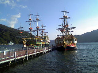 湖尻から海賊船で箱根町へ。左側の船に乗った。約三十分の船旅。
