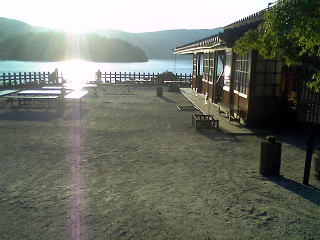 沈み始めた夕日が芦ノ湖の湖面に光線を落とす。関所脇のお茶屋に斜光が照りつける。人気の無い寂寥感。ああ、良い感じ・・・・・・