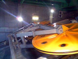 右へ分かれていくレールが検修施設へのものと思われる。動力となるタイヤが無いところをみると、人力移動だろうか?
