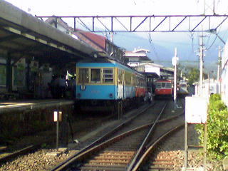 すでに接続の電車は入線しており、席の確保が難しいため、一本待つことに。次の電車は幸運なことに塗色復元車だった。だが、前の電車の方が個人的には「当たり」の釣り掛け電車・・・