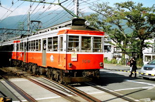 先発の湯本行き電車が発車。3両連結で後ろ2両は間違いなく釣り掛け駆動だ。