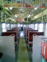 形式、車内の様子、逆エンド側といったところで・・・。以前、乗ったときはまだ木張りの床だったんですが、さすがに張り替えたらしい。でも、窓枠とテーブルは相変わらず木製でした。