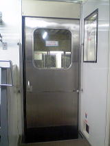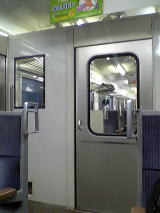 左から、キハ52の運転台付近客室、新設されたデッキ仕切り、ドア。仕切りは完全に遮蔽されているわけではなく、上部は開いている。換気が云々と言うものではなく、ただ単にコスト削減が目的だと思われる。ドアは取っ手付なのが花輪の特徴。