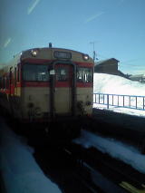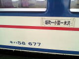 盛←キハ52+キハ58→大、の二両編成。52の方はデッキ間の客室が仕切られて簡易デッキ構造になっている。とりあえずキハ58のほうに席を取り、空いてきたら52の方に移ろう。