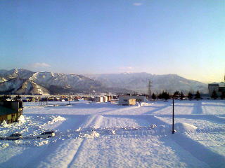 雪に隠されてはいるが、新潟中越地震の傷跡はそこここに見え隠れする。崩壊した道路とか、倒壊した家屋とか。特に白一色の中、青いビニールシートは目立つ。