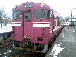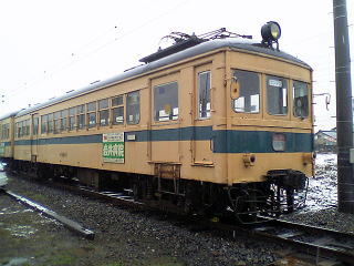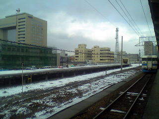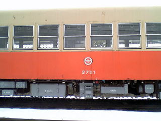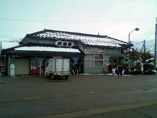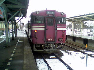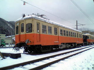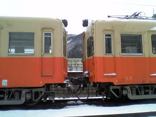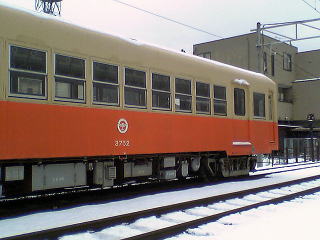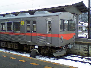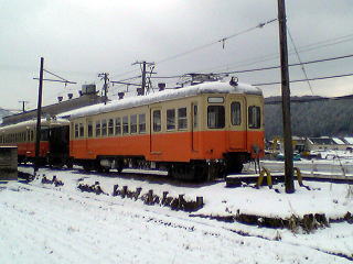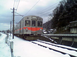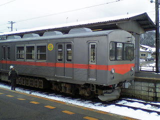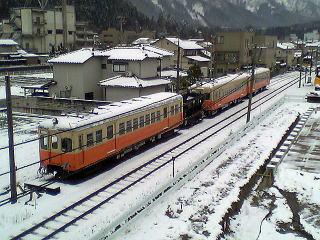 気分を換えて、さっきとは別の車輌で。雪が降ったりやんだり。今回の旅行では、メインルートの北陸本線沿いを外れると、途端に雪が激しくなる。勝山、白山、城端しかり。
