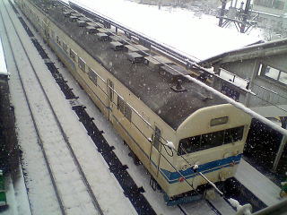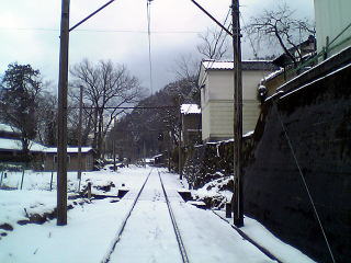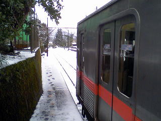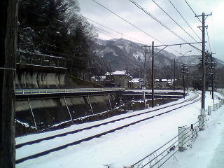 湖西線とのジャンクション。山の中で線路が上へ下へ・・・。10センチくらいの積雪だ。