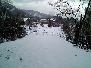 さすがに4月目前とあって完全な雪原と言うわけにはいかなかったか・・・奥の山は標高939mの医王山だと思われる。