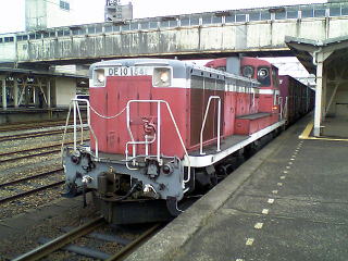 到着すると、隣のホームにはDE10 1541の牽引するコンテナ列車が。この出で立ちは二塚への貨物列車では??