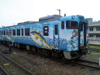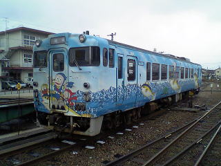 目の前の留置線にはキハ40、忍者ハットリくん色が。原作者の藤子不二雄A氏が氷見出身と言うことで、氷見線運用のあるキハ40を特別色にしたそうだ。ちなみに、マイクロエースからNゲージも出ている。