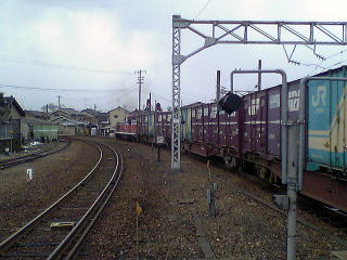 まさしく、城端線に進入してゆくコキ車。10数両連結していてかなり長編成。わずか一駅間とはいえ、DE10には精一杯の荷ではなかろうか?