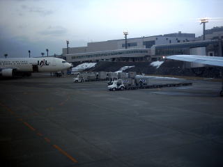 出発ロビーからJALのB767−300をみる。河川敷空港なので手前に土手がある。