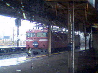 機関車交換の真っ最中だ。牽引してきたのはEF81 45号機。手前に止まっていたトワイライトカラーのEF81と交代するのだろう。なお、所定なら5時10分着、23分発なので、4時間近く遅れている。