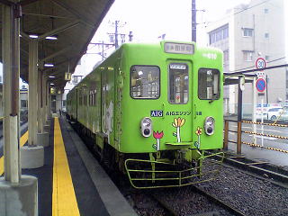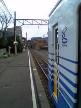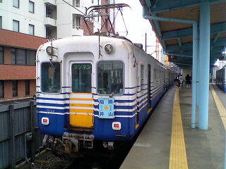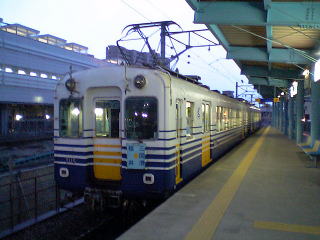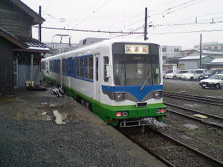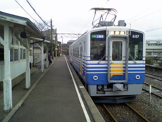 ホームで発車を待つ田原町行普通電車。元名古屋市交の600型だ。不満はあるものの、取り敢えずこれに乗って隣の西武生まで行くことにする。