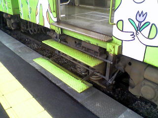 福井鉄道の車輌の最大の特徴がこのドア下のステップ。ドアの開閉に連動して展開する。福井市内の路面区間での乗降用の設備だったが、低床車の運行開始を前にホーム高さが下げられた影響で鉄道線区間でも使わざるを得なくなったのだろう。