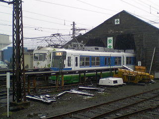 駅舎裏の側線で待機する連接車体の元名鉄770。