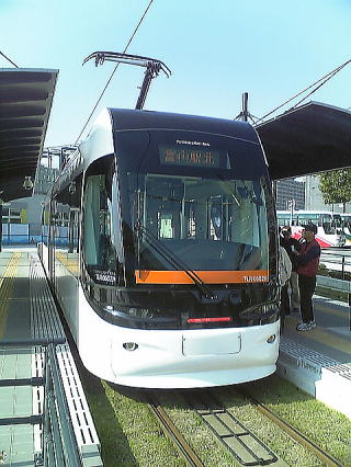 車輌は新潟トランシス製の2連接LRTで、7編成が導入された。写真は富山駅北に入線するTLR605編成。カラーはグリーン。