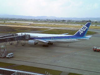 折り返し東京行きとなるB777がエプロンに入ってきた。まず、写真手前中央のマーシャラーにしたがってタキシーしてくる。