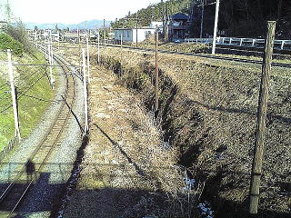 専用線の勾配のほぼ頂点に踏切があり、その先は鉄橋で旅客線と廃線跡を跨いでいる。陸橋の上から影森側を臨む。この辺りから旅客線、廃線跡ともに専用線から分かれ始め、廃線跡は緩い上り勾配になる。旅客線と専用線との高度差も解ると思うが、わずか2〜300mの距離でこれだけ高度を取るのだからかなりの勾配である。上ってくるほうは空のホッパー車だから大丈夫なんだろうが、満載の列車だったらこれは登れないよ・・・