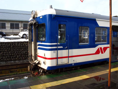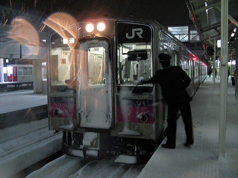 交換待ち。プチ下車。巻き上げる雪粉が車体にまとわり付いて凍りつく。それが冬の東北の列車