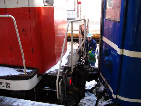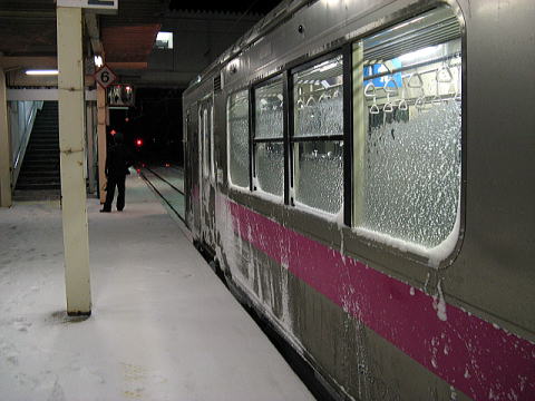 クモハ701−8。運転士さんはこびりついた雪を除去中。もうワイパーで掻き出すだけじゃ間に合わないんだ。拭き残しは凍っちゃうし