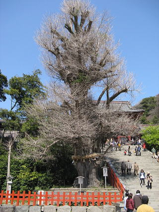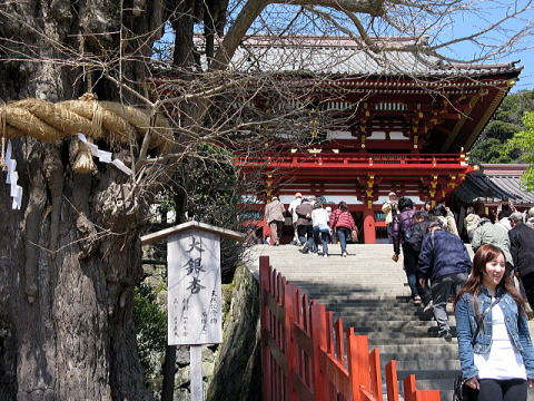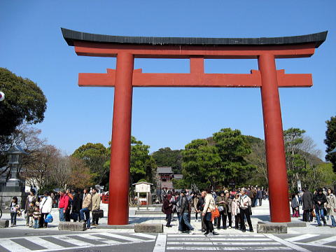 段葛をのったら歩いて、八幡宮の入り口へ。朱塗りの大鳥居が出迎えてくれた。観光客多い・・・隣でガイジンさんが写真撮っている・・・・・・