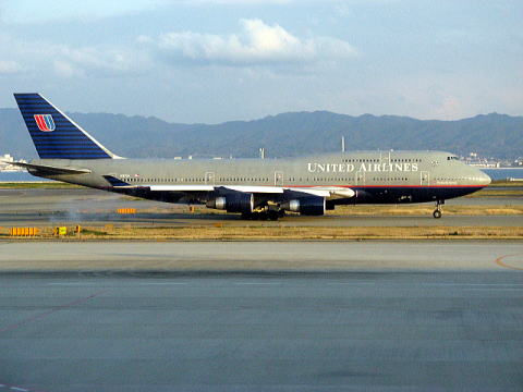 そのうち珍しくなるかもしれない、旧塗装のユナイテッドB747−400。現在は塗り替え真っ最中。エンジン始動したてで白煙噴いてる