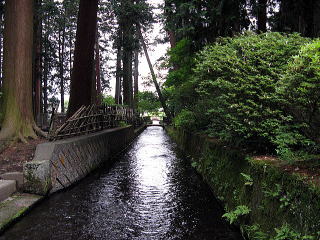 大鳥居の前を水路が横切る。流量豊富な富士の霊水というわけか