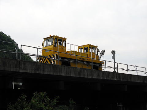 工事用車両がゆっくりとやってきた。軌道巡回車かなにかだろう。今日の実験走行の前に軌道をチェックでもしているのだろうか。なお、この車両は浮上式ではなく、普通のタイヤで軌道上を動いているように見受けられた。しぶとく待っていれば、実験車両も見れたかも・・・でも、我慢できない人間なものでwww