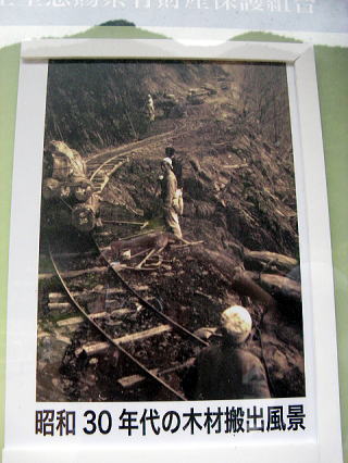 林業華やかりし頃の写真だね。下りは勝手に転がして、上りは牛引きで上げていたのだろう。そんな写真を見ていたら、ある一点に視線が止まる