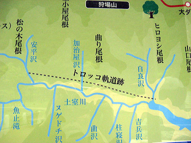 ダムの喫水が下がっているので、水没した旧道が顔を覗かせている。この界隈には林道に化けた小金沢林鉄の他に、北側に分岐してもう一本土室川にも林鉄が延びていた。あるとすれば、写真の谷間を通っていたと思うのだが、痕跡はなし・・・