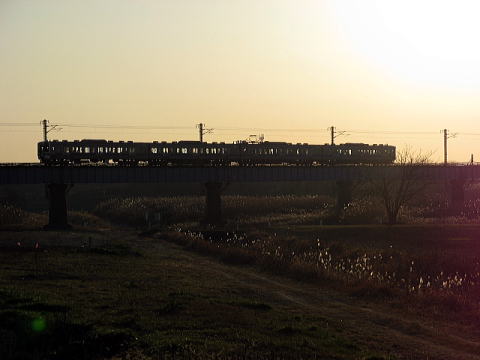 鬼怒川橋梁をわたる415系小山行。どうせまともに撮れないので逆光でシルエットにしてみる