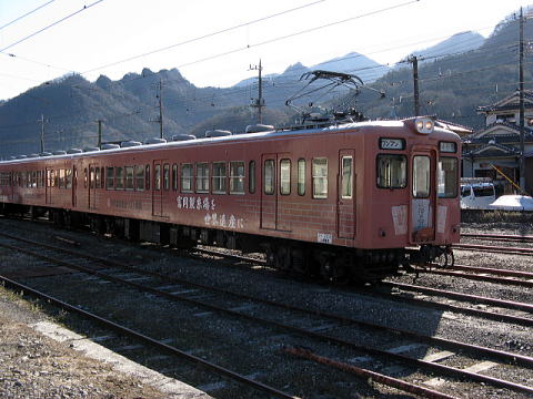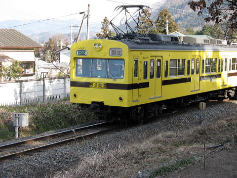 下仁田に到着したクモハ1201。1000形は上信電鉄のフラッグシップとして3両編成1本が製造された。地方私鉄が作成したオリジナルの電車としては秀逸なデザインで、1977年の鉄道友の会ローレル賞を受賞している。近年、上信線旅客列車の2連運用化に伴い、中間のモハ1201にクハ1301の運転台を取り付け、クモハ1201として2連化された