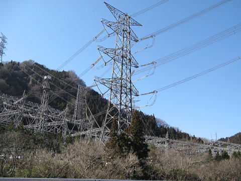 秩父の奥、山深くに突如現れた夥しい数の高圧線と高圧鉄塔群は「東京電力 新秩父開閉所」だった。開閉所ってのは高圧電線の中継所。ここには5系統の送電線が出入りしている。新信濃発電所からの安曇幹線1号、2号、新榛名変電所からの新榛名線、新多摩変電所からの新秩父線。出てゆくほうに、新岡部変電所への新岡部線がある。さらに、この開閉所の脇を通り過ぎて行くだけの黒部幹線てのと、安曇幹線の新所沢変電所への休止線まである。電線銀座だwwwヤシマ作戦でもやるんかよっ!?という感じに電線ばっかりだ。はっきり言って異様