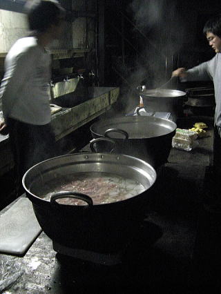 調理場はこんな感じ。広い!けどちょっと暗い。昼間でも屋内なのでこの暗さ。3倍くらい電灯が欲しい