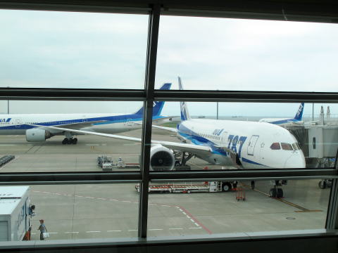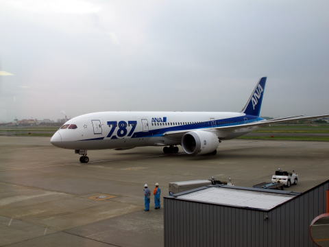B787−8、JA803A。搭乗する伊丹行25便は先行量産機であった。1月に飛行停止になり、5月末に復帰して以降初、都合これが4度目のドリームライナーのフライトとなる