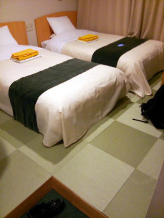 部屋はベッドの洋室だが、床は畳み敷きになっていて素足で歩ける面白い構造