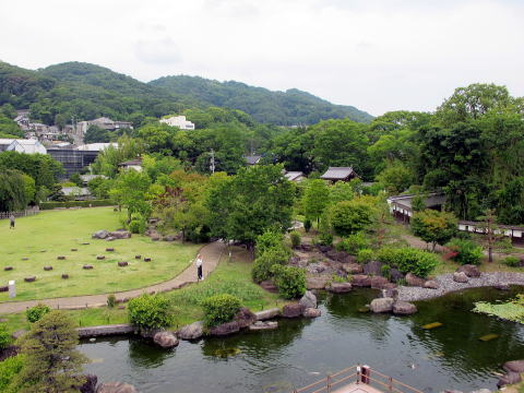 標高50mほどの高台は城址公園となっており、市民の憩いの場となっている。並んでいるのは礎石の跡