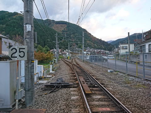 坂道をのぼると、最初の踏切。奥多摩駅が遠望できる