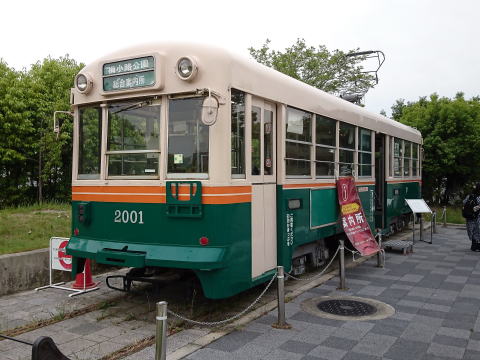 駅前広場左手直ぐに展示保存されている京都市電2000型のトップナンバー。1964年から65年にかけて6両が新造された