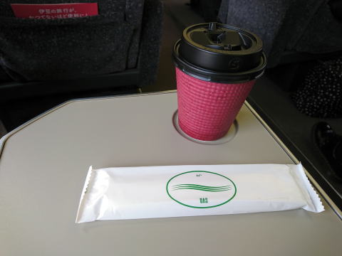 横浜を発車して戸塚辺りでドリンクがやってきた。おかわりも自由とのことだが、熱海まで1時間程度ではおかわりオーダーするほどの余裕も無かった。ホットドリンクにコーヒー、紅茶、緑茶、コールドにオレンジジュースと緑茶が選べたみたい。あんまりしっかり確認せずに、ほぼ条件反射的にホットコーヒーを選んだ
