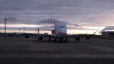 正面から。2階建てが特徴のB747よりも、さらに高く大きい荷室部分。こんなデザインで飛ぶんだな・・・・・・
