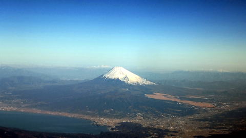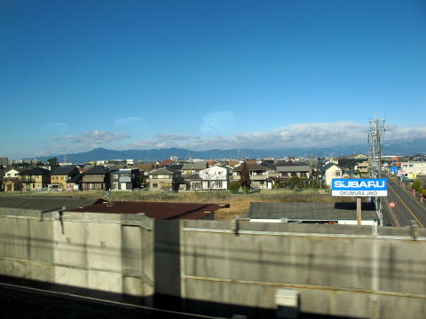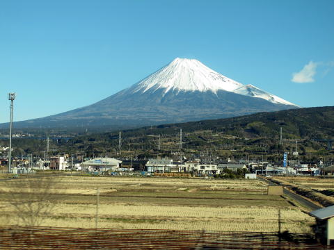 静岡を過ぎると雲も無くなり、典型的冬型気圧配置な好天の関東平野が見えてくる。伊豆半島東端から富士山を見る