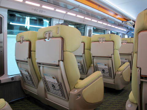 1号車、ク50602のプレミアムシート。大型のシェルタイプシートで座り心地よく、ハイデッキ構造で側面の眺めも良い