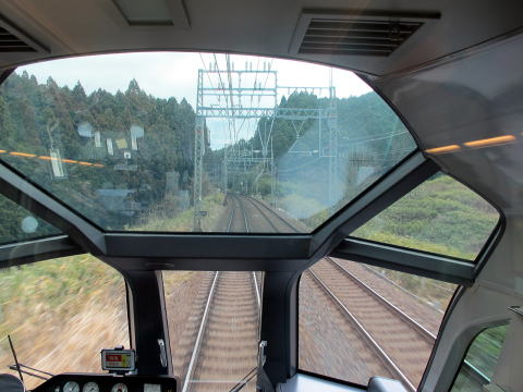 大和八木から大阪線に入り、桜井を過ぎると山間部に。まずは榛原に向けての山越え区間だ。ちょっと一番前まで見物に来てみた。フレームが多いのであまり見通しは良くないな