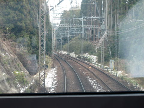 この先、名古屋〜京都間、雪のため減速運転予定。10分程度の遅れが見込まれるとの事