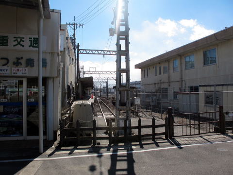 踏切を見てから北勢線西桑名駅に戻る。ここが北勢線の終端部。モニ220が活躍していた時代は電動車が2両程度の付随車を牽いて運行されていたが、電動車は必ず編成先端に連結され機関車のように付随車を引っ張るのが定位だった。そのため終端駅には機回し線が設置されていたが、現在も西桑名にはそのスペースが残っているのが確認できる