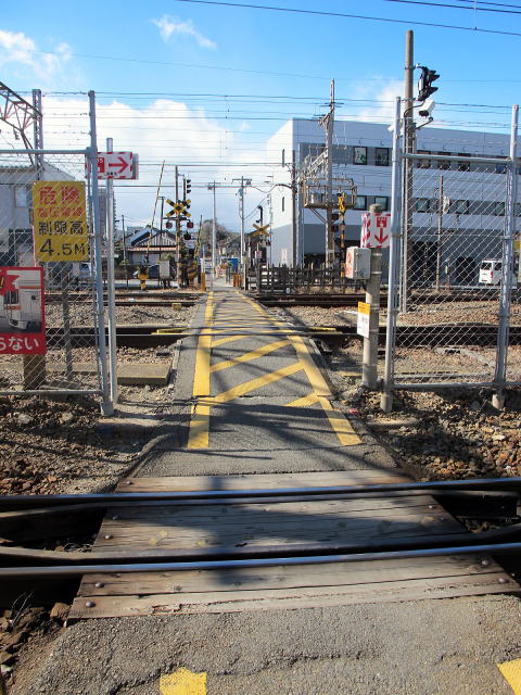 北勢線に乗るつもりなのだが、少し時間があるので有名な踏切を見に行ってみる。手前が762mmの北勢線、直ぐ向こうがJR関西本線の1067mm、その向こう踏切警報機があるのが近鉄名古屋線の1432mm軌間。ここは日本で唯一の3種類のゲージがいっぺんに見られる踏切なのだ。もう少し上から撮影出来れば線路幅も実感できるが、特に機材も無いので仕方ない